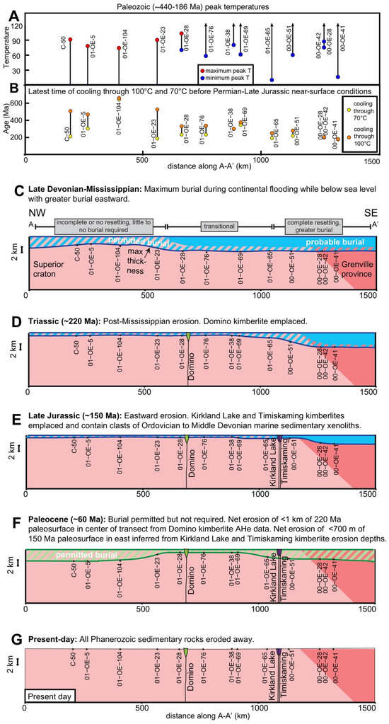 Summary of constraints from the thermal history models on (A) maximum and minimum peak temperatures from ~440 to 186 Ma and (B) latest time of cooling through 100 °C and 70 °C before near-surface conditions in Permian–Late Jurassic time. Approximate burial depths marked on right axis of (A) correspond to the temperatures on the left axis, assuming a 20 °C/km geotherm and 5 °C surface temperature. (C–G) Preferred burial and erosion model for the Superior Craton and western part of the Grenville Province along section line A–A’ in Figure 1A. Solid blue shading shows the approximate required Paleozoic–early Mesozoic burial thickness, hatched blue shading shows the approximate permitted Paleozoic to early Mesozoic burial magnitude, and hatched green shading shows the approximate permitted Cretaceous and younger burial thickness. These estimates are derived by combining the thermal history modeling results with the geothermal gradient and surface temperature assumptions as described in the text.