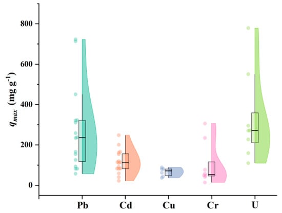 Raincloud plots of the maximum adsorption capacity of PBC for typical heavy metals.