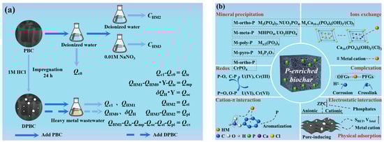 The potential mechanisms of heavy metal adsorption by PBC in water include mineral precipitation, ion exchange, functional group complexation, electrostatic interaction, physical adsorption, cation-π interaction, and redox (Figure 2b). Cui [74] proposed that the contributions of ion exchange and mineral precipitation to adsorption can be determined by comparing the amount of heavy metals adsorbed by PBC and the net release of alkali metal cations before and after demineralization. The contributions of functional group complexation can be determined by comparing the pH changes before and after adsorption of heavy metals by demineralized PBC (DPBC). Zhang [75] suggested that the contributions of physical adsorption and electrostatic adsorption can be determined by oscillating saturated biochar in ultra-pure water and 0.01 M NaNO3 solution, respectively, to remove the physically adsorbed heavy metals. The difference in adsorption between the two cases can then be calculated to determine the contribution of the cation-π bond (Figure 2a). Based on this, studies have shown that the highest adsorption contribution in the original biochar is typically attributed to ion exchange, while mineral precipitation or ion exchange in PBC accounts for the highest adsorption contribution [39,71,76,77].