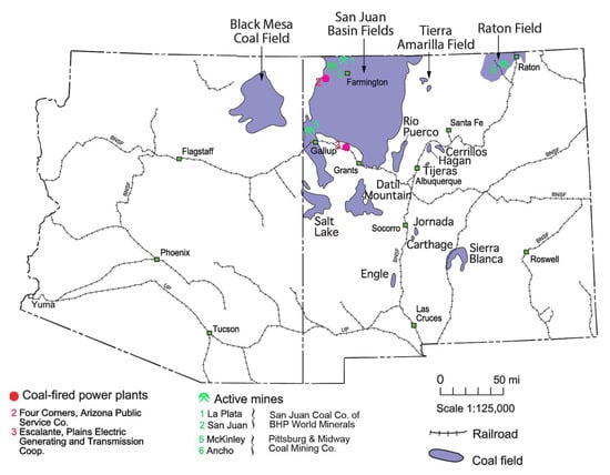 Field sampling sites of coal (green mill signs) and fly ash for REE determination (red dots). Base map was modified from Hoffman, 2000 [].