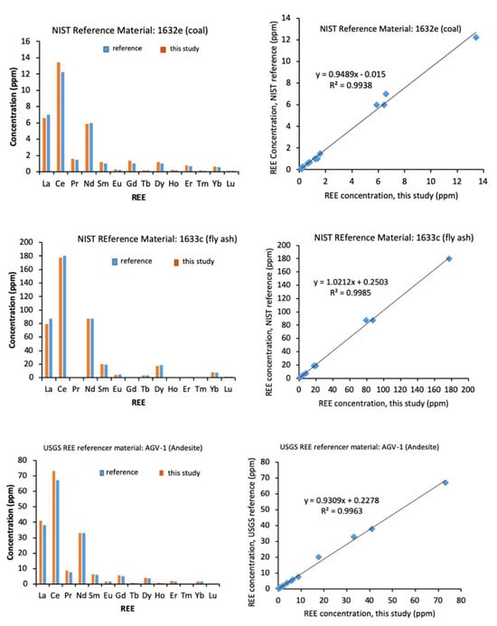 To assess the efficacy of the HBF4 acid digestion method, we employed the REE standard reference materials (SRM) NIST 1632e (coal) and NIST 1633c (fly ash), as well as the geological reference material USGS AGV-1 (andesite) [] (Table 1). We examined coal and fly ash samples obtained from various locations in the southwestern United States to determine their REE concentrations using the HBF4 method. The coal samples were ground using a mortar and pestle. The resulting powder was sieved to achieve a particle size of less than 74 μm. Fly ash samples (PFA78480 and Escalante E-2) collected from two power plants exhibited an extremely fine particle size, measuring less than 50 μm as confirmed by SEM examination. Prior to use, the fly ash samples were ground and subsequently sieved. Approximately 30 to 40 mg of powdered coal or fly ash sample was accurately weighed for the acid digestion after shaking the sample vial to ensure homogenization. The REE reference materials and coal and fly ash samples underwent digestion utilizing the PerkinElmer Microwave Preparation System (MPS, PerkinElmer Titan MPS, PerkinElmer, Waltham, MA 02451, USA), specifically the PerkinElmer Titan MPS. Subsequently, the digested samples were subjected to analysis using the PerkinElmer ICP-MS NexIon 300s (PerkinElmer, Waltham, MA 02451, USA).