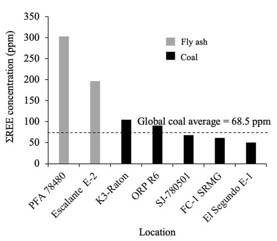 Total SREE concentration in coal and fly ash from SW USA, showing significant enrichment of REEs in fly ash. The dashed line indicates the global average of REEs in coal, which is 68.5 ppm [].