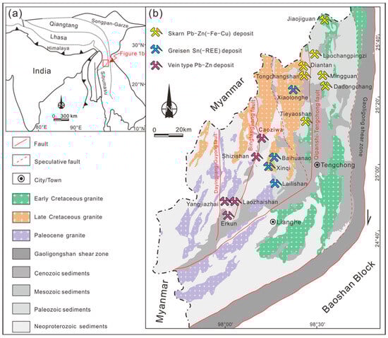 - Cao, H.W.; Zou, H.; Zhang, Y.H.; Zhang, S.T.; Zheng, L.; Zhang, L.K.; Tang, L.; Pei, Q.M. Late Cretaceous magmatism and related metallogeny in the Tengchong area: Evidence from geochronological, isotopic and geochemical data from the Xiaolonghe Sn deposit, western Yunnan, China. Ore Geol. Rev. 2016, 78, 196–212. [Google Scholar] [CrossRef]