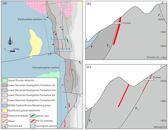 - Yu, D.S.; Xu, D.R.; Zhao, Z.X.; Huang, Q.Y.; Wang, Z.L.; Deng, T.; Zou, S.H. Genesis of the Taolin Pb-Zn deposit in northeastern Hunan Province, South China: Constraints from trace elements and oxygen-sulfur-lead isotopes of the hydrothermal minerals. Miner. Depos. 2020, 55, 1467–1488. [Google Scholar] [CrossRef]