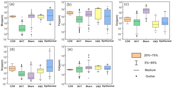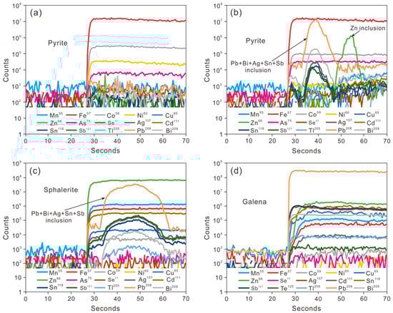 - Cook, N.J.; Ciobanu, C.L.; Pring, A.; Skinner, W.; Shimizu, M.; Danyushevsky, L.; Saini-Eidukat, B.; Melcher, F. Trace and minor elements in sphalerite: A LA-ICPMS study. Geochim. Cosmochim. Acta 2009, 73, 4761–4791. [Google Scholar] [CrossRef]