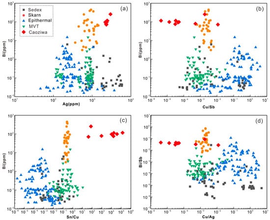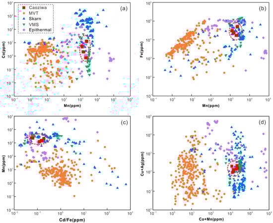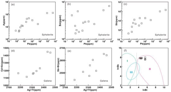 - In the Caoziwa Pb–Zn deposit, abundant Co, Ni, As, and Se, and less Cu, Zn, Ag, Cd, Sn, Sb, Te, Pb, and Bi could enter the pyrite crystal lattice by isomorphic substitution. Elemental Mn, Fe, Cd, Co, and Ni could enter the crystal lattice of sphalerite by isomorphic substitution, while the Ag, Sn, and Sb contents are mainly controlled by the Pb-rich inclusions in sphalerite. Elemental Bi, Sb, Cd, Sn, Ag, and Tl mainly enter the galena grains by the isomorphic substitution mechanism of (Bi, Sb)3+ + (Cd, Sn)2+ + (Ag, Tl)+ ↔ 2Pb2+.
