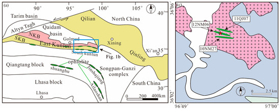- Dong, Y.P.; He, D.F.; Sun, S.S.; Liu, X.M.; Zhou, X.H.; Zhang, F.F.; Yang, Z.; Cheng, B.; Zhao, G.C.; Li, J.H. Subduction and accretionary tectonics of the East Kunlun orogen, western segment of the Central China Orogenic System. Earth Sci. Rev. 2018, 186, 231–261. [Google Scholar] [CrossRef]