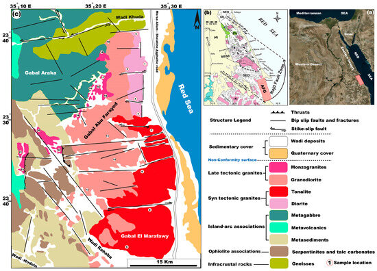 The Arabian–Nubian Shield (ANS), which forms one of the major magmatic belts, is thought to have undergone multi-cycle tectonic development throughout the Neoproterozoic era [1]. The ANS consists primarily of Neoproterozoic (880–630 Ma) juvenile crust formed through the accumulation of several arc terrains [2]. The amalgamated arc terrains and associated ophiolite remnants were intruded by voluminous granitoids. The ANS’s granitic intrusions were emplaced during two major magmatic episodes; the Early (720–650 Ma) and Late (650–540 Ma) stages were created in volcanic-arc, syn-collisional, and late–post-collisional environments, respectively [3,4,5,6,7,8]. The subduction stage was characterized by pre-collisional and syn-orogenic calc–alkaline magmatism between 650 and 620 Ma [4,6,8]. This was followed by post-collisional magmatism that included high-K calc–alkaline and alkaline magmas. The post-collisional granitoids are undeformed rocks that have nearly equidimensional intrusions with dimensions of 1 to 10 km, cutting all the other basement associations with sharp contacts. They are intruded by post-emplacement granitic dykes, Katherina volcanic rocks, and Tertiary plugs. In many areas, the younger granites’ marginal facies are distinguished by fine-grained, narrow-chilled margins, whereas the surrounding country rocks can have contact aureoles due to thermal metamorphism [3,9,10,11]. Earlier studies of these intrusions reported diverse ranges of geochemical features, ages, and tectonic settings, although these rocks’ genesis and geotectonic evolution remain controversial. The granitoid rocks at Wadi Beitan, west of AFG, were classified into two major groups [12]: (1) diorite, tonalite, and granodiorite (oldest) and (2) biotite granite, perthitic leucogranite, albite granite, and pegmatitic granite (youngest). The granitoid rocks at Abu Farayed (AFG) and Gabal El-Marafawy are highly deformed, infra-structural units that were overthrusted by the suprastructural associations, i.e., the Pan-African serpentinites, island arc metavolcanic rocks, and their intrusive equivalents [13]. The rock units forming the AFG were categorized into tonalite and adamellite [14], with minor quartz and pegmatite veins. Advanced remote sensing techniques were used to map the rock units at Wadi Hodein and Wadi Rahaba [15] towards the western and southern sectors of AFG; accordingly, the rock units in these areas were mapped as ophiolites, calc–alkaline metavolcanic rocks and syn- to late-tectonic granites, with four deformational phases that influenced the area were also recognized. The granitic rocks around Wadi Rahaba were classified into tonalites, granites, and pegmatites [16]; they also reported considerable enrichments in large-ion lithophile elements (LILE: Rb, Ba, Sr, Pb) and high field strength elements (HFSE) Y, Zr, Th, U, Nb within these rocks. Multispectral and radar data [17] succeeded in identifying potential gold occurrences and major shear zones along the Wadi Beitan–Wadi Rahaba northern areas of the AFG. Remarkable enrichments in rare earth element metals and some HFSE, such as U, Pb, Rb, Y, Zr, Th, U, Nb, and Ta, were recorded within the AFG [18]. The K-Ar technique was used [19] for dating granite varieties at the AFG intrusion, concluding that the older tonalitic suite yields ages ranging from 647 ± 25 to 630 ± 24 Ma, while the K-Ar age of the younger granitic suite of AFG is 614 ± 23 Ma.