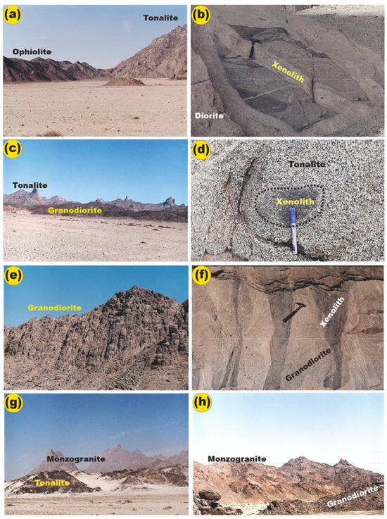 Field photographs of (a) an intrusive contact between the ophiolitic mélange (left side with dark color) and the granite pluton (right side); (b) layered amphibolite xenoliths within diorite; (c) high-relief tonalite (top hill) intruded by low-lying granodiorite; (d) tonalite enclosing irregular diorite xenoliths with diffused contacts; (e) prominent vertically jointed granodiorite indicating the structure effects during the emplacement; (f) elongated diorite xenoliths with diffuse borders enclosed within granodiorite; (g) salient spines of granite at the AFG; (h) highly elevated granite plugs with white to pink colors intruding low-land granodiorite that has a grey color.