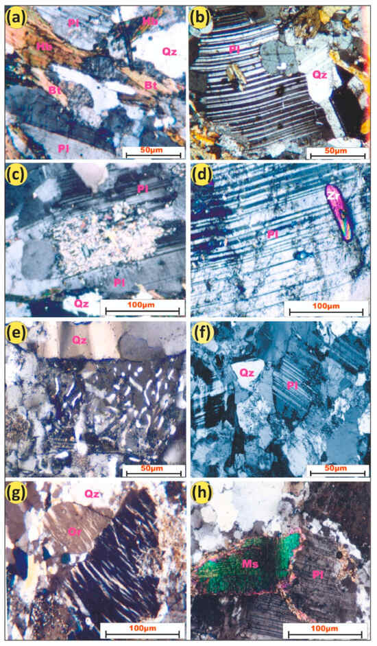 A detailed mineralogical description is provided in Table 1. The older granites range in composition from diorite to quartz diorite to tonalite, whereas the younger granites range from granodiorite to granite. The diorites are composed of plagioclase and hornblende together with variable proportions of biotite and minor quartz. Iron oxides and apatite are common accessories, whereas epidote, chlorite, sericite, and kaolinite are common secondary constituents. Plagioclase (An30–40) forms euhedral to subhedral tabular crystals with deformed twinning (Figure 3b). It is slightly altered to sericite and kaolinite and sometimes corroded by quartz. Quartz diorites are similar mineralogically to the diorites, but they contain higher amounts of quartz. Tonalite is composed mainly of plagioclase, quartz, alkali feldspar, biotite, and hornblende. Iron oxides, zircon, apatite, and allanite are accessories, whereas chlorite and epidote are secondary minerals. Hypidiomorphic granular texture is common in the entire section. Zoned plagioclase with altered cores and fresh rims (Figure 3c) is twinned according to the pericline and Carlsbad twin laws. Granodiorite is composed of plagioclase, quartz, alkali feldspars, and biotite. Allanite, zircon, and iron oxides are primary accessory phases, whereas kaolinite, epidote, sericite, and chlorite are common secondary minerals (Figure 3d). Graphic, granophyric, perthitic, and myrmekitic textures are common (Figure 3e). Plagioclase (oligoclase, An16) is twinned and sometimes zoned. Alkali feldspars are represented by orthoclase, orthoclase perthite, microcline, and microcline perthite. Perthites are of vein, flame, string, herringbone, and patchy types. Granite is composed of alkali feldspars, quartz, plagioclase, biotite, and muscovite. Iron oxides, allanite, and zircon are primary accessory phases, whereas kaolinite, chlorite, and epidote are common secondary minerals. Hypidiomorphic granular texture is common in the granite (Figure 3f). The orthoclase forms subhedral to anhedral crystals and is characterized by a herring-bone twin pattern (Figure 3g). Muscovite forms subhedral flakes and displays a resorption reaction texture against plagioclase (Figure 3h).