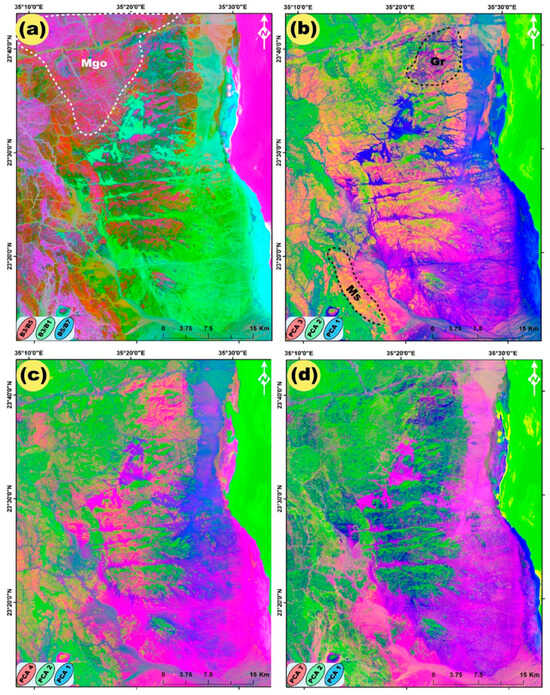 A principal component analysis (PCA) can remove noise constituents and decrease the dimensionality of the original data [30]. The combinations of Landsat PCA-RGB-321, PCA-RGB-421, and PCA-RGB 721 enabled the best separation of the different rock units in the AFG area (Figure 5a–c). According to PCA-RGB-321, tonalite exhibits a pale violet color, diorite and granodiorite are light orange, and granites (Gr) are pink. Serpentinite appears as dark green, and the island arc assemblage is associated with light orange colors (Figure 5b). Using (PCA) RGB-421, the granodiorite–tonalite has dark violet colors. Diorite appears with a blue tone, while granite has dark pink colors (Figure 5c). The PCA RGB-721 displays the older granites with a light violet tone, while the granodiorite and granites have shades of green (Figure 5d).