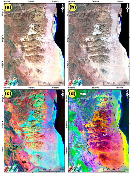 False color composite images showing (a) RGB-753 and (b) RGB-654 band ratio images; (c) (7/5R, 5/4G, 3/1B); (d) (6/2R, 7/6G, 6/5*4/5B). Gr = granite; Srp = serpentinite; Ms = metasediments; Mgb = metagabbro.