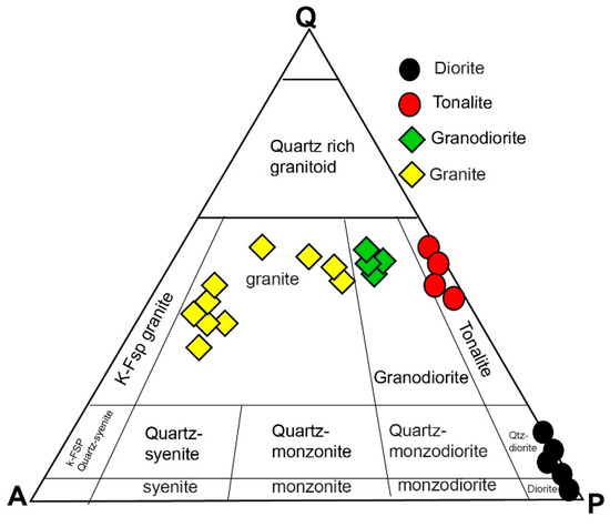 The average chemical composition of the studied older granites is comparable to the average chemical composition of the Egyptian older granites [45] and high-calcium granites [46]. From this comparison, it is obvious that the studied older granites are more or less comparable to the high-calcium granites, except in SiO2 and K2O, which are slightly lower, and Al2O3, CaO, MgO, and Na2O, which are relatively higher in the AFG than in the high-calcium granites. Their average chemical compositions are in harmony with the Egyptian older granites studied [45], except for lower SiO2 and K2O contents and higher Al2O3, MgO, and CaO contents in the AFG older granites.