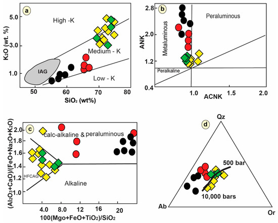 Geochemical diagrams of the AFG show (a) K2O versus SiO2 diagram [32], (b) ANK versus ACNK plot [33], (c) (Al2O3 + CaO)/(FeO + Na2O + K2O) versus 100(MgO + FeO + TiO2)/SiO2 binary plot [34], and (d) Qz–Ab–Or ternary diagram [35].