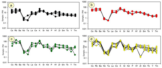 Primitive mantle-normalized extended trace element patterns [36] of (a) diorite, (b) tonalite, (c) granodiorite, and (d) granite. Normalizing data are from [36].