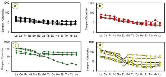 Chondrite-normalized rare earth elements patterns: (a) diorite, (b) tonalite, (c) granodiorite, and (d) granite. Normalizing values are from [36].