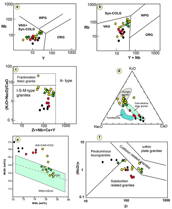 Geochemical diagrams showing (a) Nb (ppm) versus Y (ppm), (b) Rb (ppm) versus Y + Nb (ppm) diagrams after [40], (c) discrimination diagram between igneous (I), sedimentary (S), mantle (M), and an orogenic A-type granite with Zr + Nb + Ce + Y (ppm) against (K2O + Na2O)/CaO [41], (d) K2O—Na2O—CaO ternary plot [4], (e) Al2O3 versus SiO2 (wt.%) discrimination diagram [31], and (f) binary plot of Zr (ppm) versus primitive mantle-normalized Nb/Zr ratio [42]. Normalizing values are from [36].