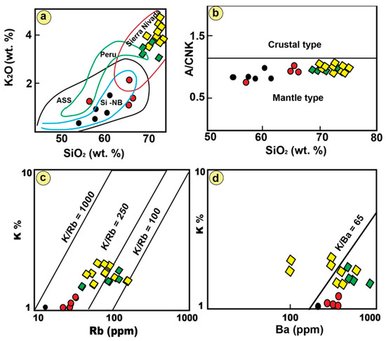 Binary plots of (a) SiO2 versus K2O on Solomon Island and New Britain (Si-NB), Sierra Nevada, Peru, and the Asir super-suite, Saudi Arabia (ASS), (b) SiO2 versus A/CNK for mantle- and crustal-type granites [50], (c) Rb versus K % [50], and (d) Ba (ppm) versus K % [56].