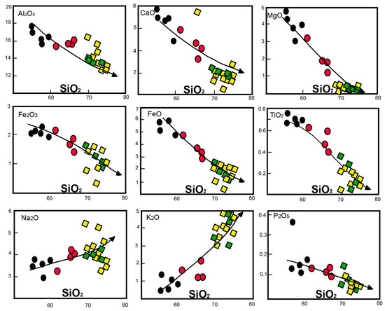 The Harker diagrams (Figure 13) display a notable decrease in Al2O3 contents with increasing SiO2 from the older granites to the younger phase, which is attributed to the fractional crystallization of plagioclase. K2O contents regularly increase with increasing SiO2, i.e., from diorite to tonalite to granodiorite and granites, with the latter rock types being characterized by the predominance of potash feldspars. Generally, Na2O contents increase with increasing SiO2. The regularly defined trend for Na2O is consistent with plagioclase fractionation. CaO decreases with increasing SiO2 from older to younger granites. The distributions of alkalis (Na2O and K2O) and CaO within the AFG indicate that plagioclase, alkali feldspars, and quartz play significant roles during granite evolution. This conclusion is supported by the low contents of plagioclase and the predominance of alkali feldspars and quartz from older to younger granites, i.e., towards the more evolved one. The same trend can be observed for MgO and FeO contents that decrease with increasing SiO2, confirming the fractional crystallization of ferromagnesian minerals (see Table 1). P2O5 contents decrease with increasing SiO2 from diorite to tonalite to the younger granites (Figure 11), which is interpreted to mark the crystallization of apatite [39]. TiO2 contents versus SiO2 display a negative correlation (i.e., they decrease with increasing SiO2). This regular variation of TiO2 can be explained by fractionation of biotite rather than Fe-Ti oxides, which are represented in small amounts in contrast to biotite (see Table 1). Therefore, most of the TiO2 content is accommodated in biotite.