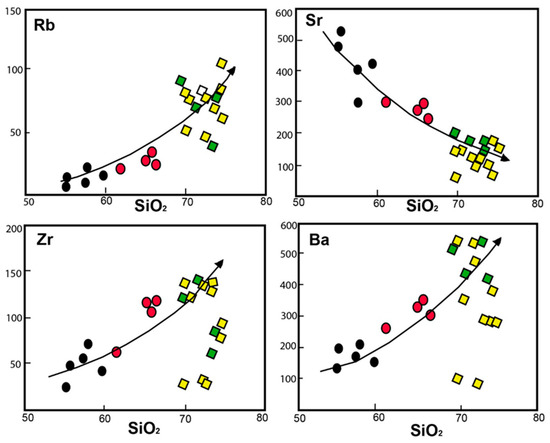 Selected trace elements, such as Sr, Rb, Ba, and Zr, are plotted versus SiO2 (Figure 14). From these plots, it is obvious that the contents of these elements in the older granites are different from those in the younger granites. Moreover, Sr decreases while Rb, Ba, and Zr increase with increasing SiO2 from the older to younger granites. Sr is expected to be concentrated in earlier Ca–plagioclase, whereas Ba concentrates in the earlier potash feldspars. Accordingly, the maximum concentration of Sr should occur in the earlier fractionating granitic series, while Ba decreases in the later fractionated series. Fractional crystallization of plagioclase could have caused the Sr decrease within the younger granites, whereas its relatively high values in older granites may indicate its main residence in plagioclase.