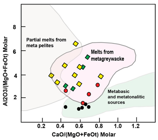 Plot of the Al2O3/(MgO + FeOT) versus the CaO/(MgO + FeOT) [58]. The compositional fields of the magmas produced through experimental melting of various sources [59,60].