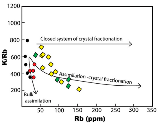 Fractional crystallization and assimilation of magma using the relationship of Rb (ppm) against K/Rb [72].