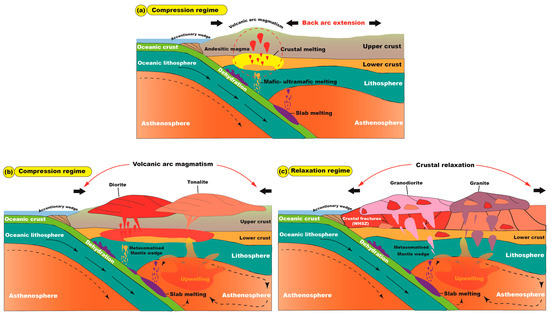 Proposed schematic diagram showing the different stages of AFG emplacement. (a,b) The subduction phase includes the initiation of magmatism at the active continental margin through the storage of magmas from the metasomatized mantle wedge and the formation of older granite at continental volcanic arc setting. (c) The relaxation stage due to the extension. The relaxation stage includes the development of deep-seated fractures, decompression melting, and crust delamination prevailing during the evolution of younger granites at the late evolutionary stages of the AFG. The colored spots within tonalite, granodiorite, and granite indicate mingling processes.