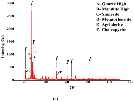 Chalcopyrite ore, with an average copper content of 0.87% (low-grade; LG), was collected from Malanjkhand, Madhya Pradesh, India. Before sorting particles for flotation, the sample was prepared using a jaw crusher, roll crusher, ball mill, and sieve shaker. The sample was used without any purification to remove oxidized layers or hydrophobic impurities. Hence, oxidative by-products may have altered the reagent’s interaction with the mineral particles. The X-ray diffraction patterns of the samples are displayed in Figure 1 (a Rigaku Smartlab Studio II was used with 3 kW: Cu Kα X-Ray radiation, High resolution θ/θ closed loop goniometer, X-Ray Beam Optics Converging Beam Optics (CBO) technology, High Resolution HyPix-3000 semiconductor detector, 0D and 1D modes with/without monochromator). A laser particle size analyzer (PSA 1190) made by Anton Paar, Graz, Austria, was used to evaluate the particle size distribution of the flotation feed.