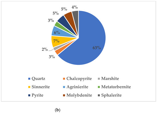 (a) XRD pattern of chalcopyrite (low-grade) flotation feed; (b) percentage composition of minerals indicated in (a).