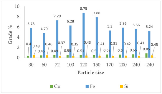 Copper (Cu) grade compared to Fe and Si in different particle size fractions of the chalcopyrite sample. where Cu, Fe, and Si percentiles represent overall grade percentages of these individual elements present in any form in the sample.