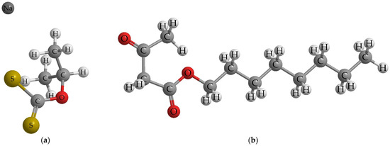 The literature indicates the application of primary collectors in conjunction with co-collectors (secondary collectors) as collector blends (mixed collectors) [15,16,17]. Numerous studies have aimed to evaluate these blends for improving concentrate quality and ensuring environmental compatibility [7,8,18]. Most sources emphasize the use of hydroxamates, carbamates, thiophosphates, dodecylamine, etc., as collector blends alongside xanthates [6,19,20,21,22,23]. Additionally, investigations have explored the use of esters derived from carboxylic acid, phosphoric acid, alkyl phosphoric acid, and MES (fatty acid methyl ester sulfonates) on various minerals such as clay, wolframite, apatite, etc. [24,25,26,27]. It is noteworthy that esters have the potential to enhance the flotation of ores with a high clay mineral content [28]. The composition and structure of these esters significantly influence specific sorption and the hydrophilization of ore mineral surfaces.