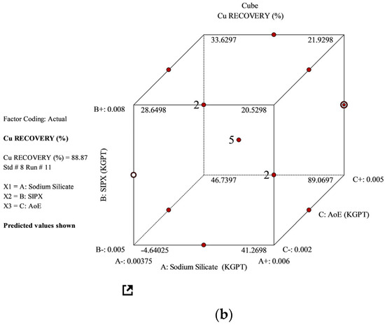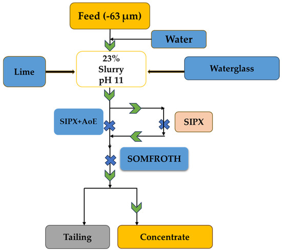 Box-Behnken design was implemented to determine the experimental setup for the flotation studies. The three-factor, three-level design generated a set of 17 experiments, to evaluate and optimize the impact of various flotation parameters on flotation performance. Figure 4 depicts the flotation experimental steps used for each experiment. The flotation tests were carried out under controlled conditions, which included a pH of 11, a temperature of 35 °C, a solid percentage of 23% by weight, a 3-min conditioning period for both the sodium silicate and SIPX, a 2-min conditioning period for AoE, and a flotation cell rotor speed of 1000 rpm (Nelson Machinery, Denver, BC, Canada), as represented in Table 3.