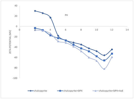 The adsorption of reagents on chalcopyrite changes the surface charge [32]. These changes aid in explaining the interaction between reagents and chalcopyrite. To understand the electro-kinetics, the zeta potential as a function of pH was measured for chalcopyrite with and without collectors. It was found that the isoelectric point of the samples was close to zero at around pH 5, which agrees with the reported data. After treatment with collectors, the zeta potential values in the tested pH range shift more towards negative, as can be observed in Figure 6. This pattern demonstrates significantly good adsorption of the said collectors on the chalcopyrite surface.