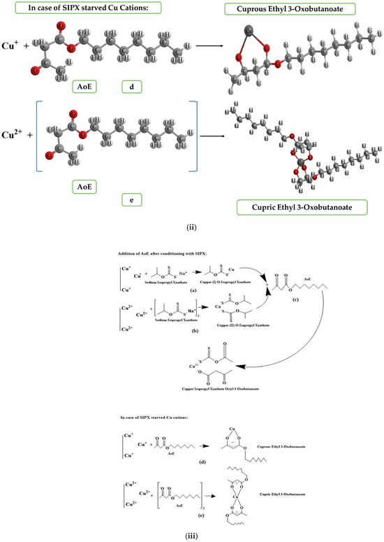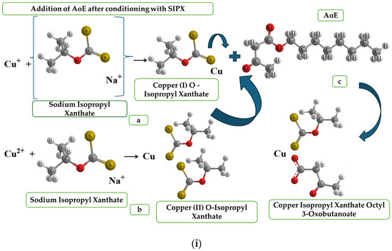 The electronegativity of chalcopyrite particles increased when treated with SIPX and AoE due to adsorption on the surface. This implies that the surface had accumulated an increased negative charge due to the presence of anionic species after adding the reagents [34]. The chemical environment of the C=S bond changed for the xanthate anion (C4H7OCS2−), and the C–O–C bond rearranged in the active species of AoE, indicating that adsorption on the surface of chalcopyrite occurred through the S− of the ketone group of SIPX and the O− of the ester carboxyl group of AoE [35,36]. The observations indicate the adsorption mode, depicted in Figure 7i–iii, as simulated using ChemDraw 19.0 software [37].