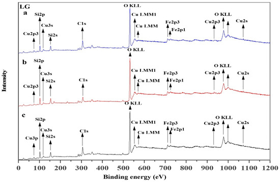 XRD spectra of flotation tailings of low-grade (LG) chalcopyrite after treatment with the collectors in comparison to before treatment.