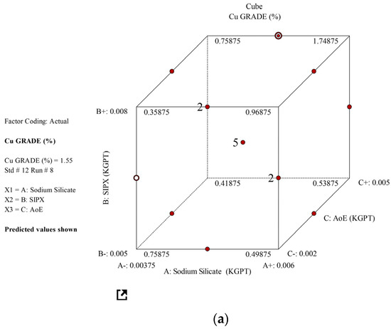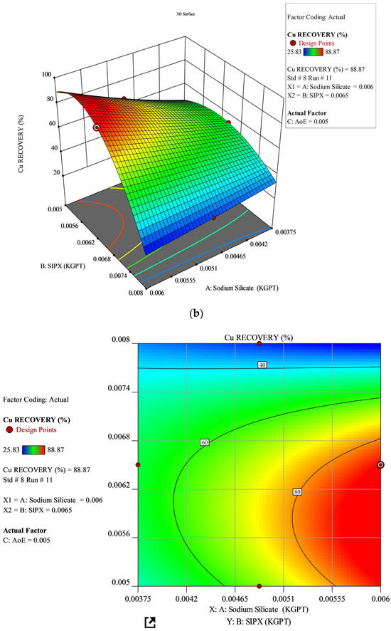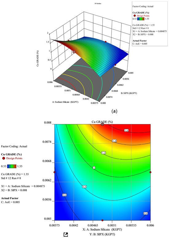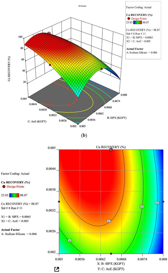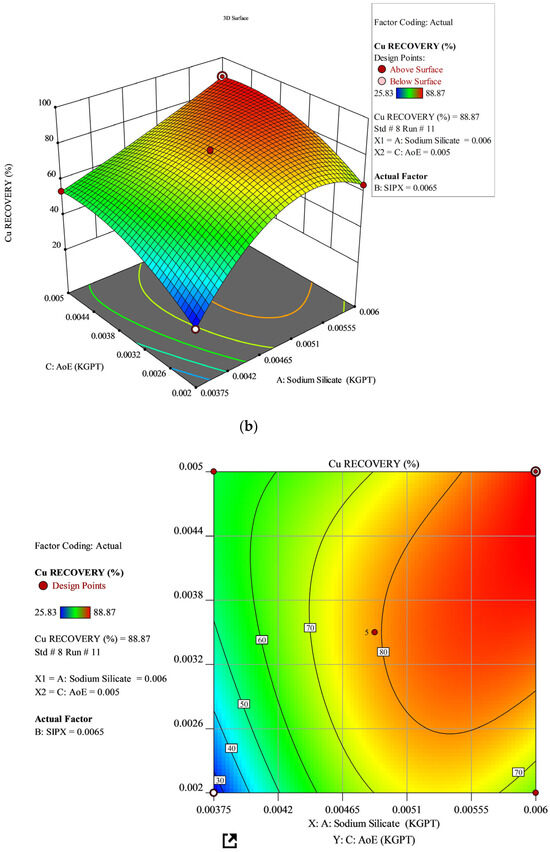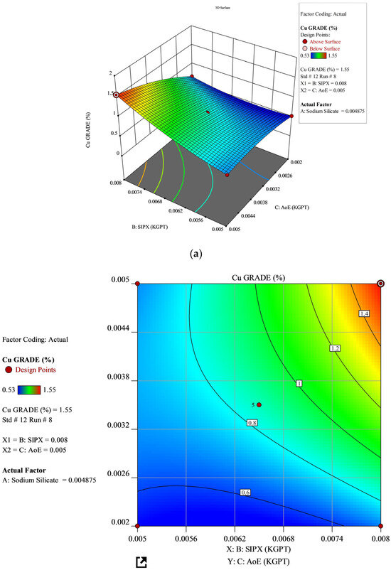 To optimize the anionic chalcopyrite flotation process with a co-collector, a three-factor, three-level Box–Behnken experimental design was utilized. The study focused on investigating three independent parameters: AoE, SIPX, and sodium silicate. The findings indicate that AoE and SIPX significantly influence both grade and recovery, while sodium silicate exhibits no direct independent effect within the tested dosage range. The experimentally determined optimal dosages are 0.006 kg/t for sodium silicate, 0.0065 kg/t for SIPX, and 0.005 kg/t for AoE, leading to a maximum recovery rate of 88.87% and a grade of 0.96%. However, the optimum grade of 1.55% was achieved with 0.0048 kg/t sodium silicate, 0.008 kg/t SIPX, and 0.005 AoE dosages, albeit with a decrease in recovery percentage. Validation experiments confirm the predictive model’s accuracy. The global index value of 0.0000147cap kg-1 per resident suggests that the copper concentrate from MTPA facilities meets the requirements of the Madhya Pradesh population.