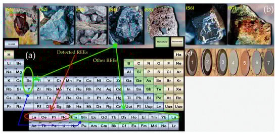 For the analytical spectroscopic study, a total of 7 samples with varying matrix and mineralization characteristics (as shown in Table 1) were prepared into pelletized forms, each with a thickness of 5 mm and a diameter of 15 mm, using a pellet presser operated with a pressure force of ~98 kN. Seven samples (labeled S1, S2, S3, S4, S5, S6, and S7) were selected, based on their REE content, mineralization characteristics, and matrix composition. The elements of interest were La, Ce, and Nd. These samples present distinct characteristics with regard to their matrix and mineralization. Figure 1a shows the full-length periodic table, highlighting the elements of interest, La, Ce, and Nd, from the REEs identified in this study. These elements belong to the group of light REEs from the lanthanoids. Light REEs are easier to detect in ores, due to their higher abundance in the Earth’s crust compared to heavy lanthanides. Their distinct geochemical behavior leads to recognizable mineral phases, aiding in detection. Light REEs also exhibit higher solubility and mobility in hydrothermal fluids, concentrating in certain geological settings. Additionally, the economic demand for these elements drives extensive exploration and research, improving detection methods. Figure 1b shows the representative 7 rock samples containing REEs, while Figure 1c shows the representative pellets of these samples used in this study.