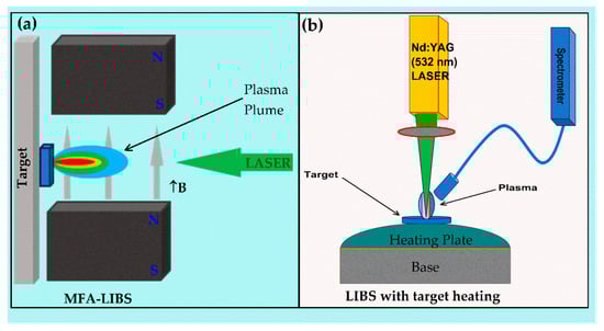 The schematic diagrams for the LIBS setup with a magnetic field and the LIBS setup with target heating are presented in Figure 2. The laser energy was optimized specifically for each configuration of the LIBS setup. Initially, the laser energy was optimized for the standard LIBS setup without the magnetic field, where 100 mJ was found to provide suitable results for the baseline experiments. Subsequently, once the magnetic field-assisted LIBS (MFA-LIBS) setup was implemented, the laser energy was re-optimized to ensure the best possible performance under the influence of the magnetic field. Through this re-optimization, the laser energy was adjusted, and it was found that 40 mJ provided the best SNR under the MFA-LIBS conditions. The SNR was determined by comparing the signal amplitude with the background noise, ensuring that 40 mJ offered the most consistent and clear spectral data. Furthermore, in the configuration where both the magnetic field and target heating (thermal LIBS) were combined (MFA-LIBS with target heating), the laser energy was again evaluated, and the same energy level of 40 mJ was maintained, as it continued to provide the optimal SNR. The target sample was placed on a high-temperature plate, and the temperature was gradually raised from 25 °C to 125 °C, at specific intervals. For each LIBS configuration, 20 laser shots were used to acquire a spectrum. To minimize uncertainty and account for energy fluctuations, the spectra from these shots were averaged over 20 repetitions. This consistency across the MFA-LIBS setups ensured reliable comparisons between the different configurations.