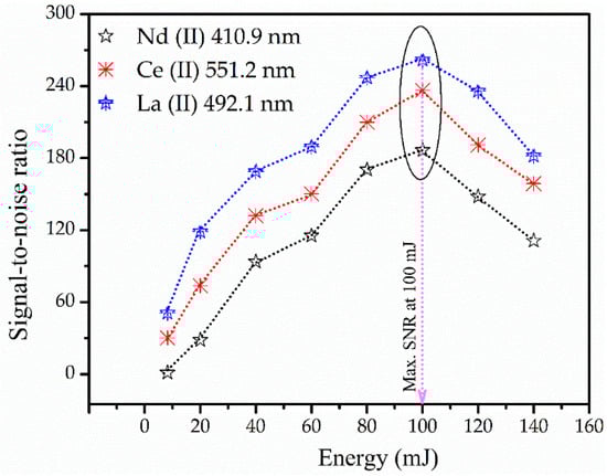 Optimized SNR at a laser energy of 100 mJ, selecting emission lines of La, Ce, and Nd.