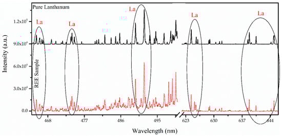 In Figure 4, we show the comparative spectrum of a representative sample S7 obtained from LIBS analysis. The spectra cover the wavelength range from 464 nm to 646 nm. This region was selected because of the relatively good SNR of the emission peaks, as REEs have abundant emission lines in the 400-to-600 nm wavelength range. The high density of these emission lines in this region makes it particularly suitable for detecting and analyzing REEs with greater accuracy. In the ore sample, various emission lines of La with a relatively smaller magnitude of intensity are detected within five line clusters, highlighted with elliptical loops in the figure, showing common lines between the pure lanthanum (La2O3) spectrum and the ore sample. In this wavelength region, La lines are detected at 465.0, 470.3, 489.9, 492.1, 510.6, 514.5, 515.9, 517.7, 521.2, 523.9, 624.9, 628.9, and 639.4 nm. In the sample spectrum, elements other than rare earths are also identified, including calcium (Ca) with a major peak at 616.2 nm, carbon (C) at 247.8 nm, iron (Fe) at 373.5 nm, potassium (K) at 766.5 nm, magnesium (Mg) at 279.6 nm, sodium (Na) at 588.9 nm, silicon (Si) at 288.2 nm, and titanium (Ti) at 334.9 nm. Table 2 shows the detected emission lines for C, Na, Mg, Si, K, Ca, Ti, Fe, La, Ce, and Nd, each at different wavelengths. The spectral lines were identified by comparing spectroscopic data such as central wavelength, transition probability (s−1), statistical weight (g), upper- and lower-level energy (cm−1), and theoretical intensity (arb. unit) from the NIST atomic spectral database [36]. Initially, only lanthanum (La) was detected with low-intensity peaks. However, upon applying a magnetic field and heating the target, additional emission lines corresponding to cerium and neodymium also appeared. This suggests that these elements were probably present as trace elements in the sample, and the signal enhancement techniques allowed their detection.
