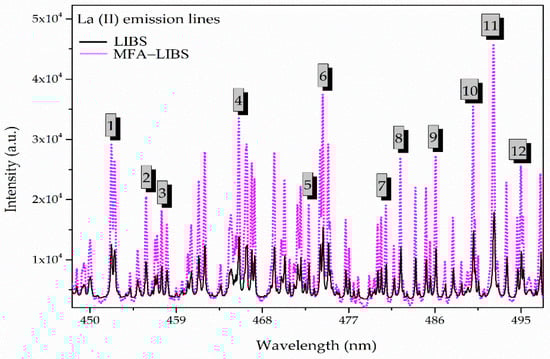 An enhanced-emission spectrum of the S7 sample with standard LIBS and MFA-LIBS showing La emission lines (numbers 1 to 12).