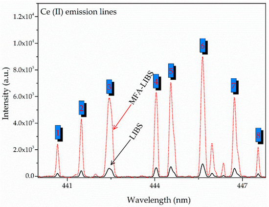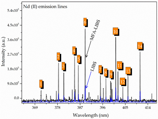 Figure 7 exhibits the comparative emission spectra of Nd within the wavelength range of 364 to 418 nm, using both standard LIBS and MFA-LIBS. The spectrum represented in blue corresponds to the standard LIBS technique, where the emission peaks of Nd are observed with very low intensity, with some peaks barely visible, or absent. In contrast, the spectrum depicted in black, obtained through MFA-LIBS, reveals well-isolated and significantly more-intense Nd peaks. This enhancement highlights the efficiency of MFA-LIBS in detecting trace amounts of REEs such as Ce and Nd, which might otherwise be missed using standard LIBS. Overall, the application of MFA-LIBS enabled the successful detection of three rare earth metals in the sample: La, Ce, and Nd.