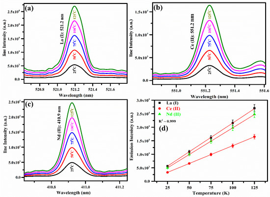 Comparison of the line intensities as a function of the wavelength of REEs of sample S7 at a temperature ranging from 25 °C to 125 °C for (a) La (I), (b) Ce (II), (c) Nd (II); (d) shows variation in the emission intensities as a function of the temperature of La (I), Ce (II), and Nd (II) spectral lines at 521.2 nm, 551.2 nm, and 410.9 nm, respectively.