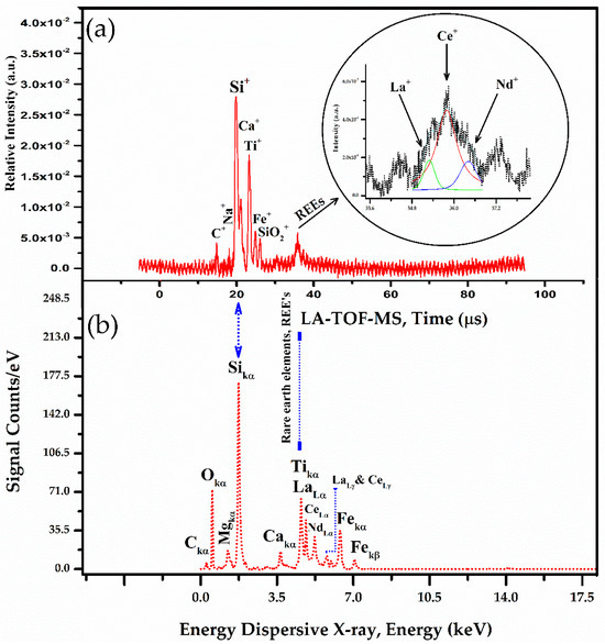 In the LA-TOF-MS analysis, a broad contour was observed from 34 to 37 μs time interval, as shown in the inset of Figure 9a. This contour corresponds to the presence of the REEs La, Ce, and Nd in the sample. While La does not have any naturally occurring stable isotopes, Ce has four isotopes, and Nd has five. As a result, the signals from these elements and their isotopes overlap, creating a single, broad contour in the spectrum. To accurately determine the composition of these elements within the sample, a multi-peak fitting procedure was employed. This method involves deconvoluting the overlapping signals to isolate and identify the individual peaks of La, Ce, and Nd, allowing for a complete analysis of their concentrations. In EDX, the cluster of peaks observed in the energy range of 4 to 6 keV is indicative of the characteristic X-ray emission (Lα and Lγ) lines of certain REEs. Specifically, the Lα lines are attributed to La at ~4.7 keV, Ce at ~4.8 keV, and Nd at ~5.2 keV. Additionally, the Lγ lines are identified with La at ~5.8 keV and Ce at ~6.1 keV. These lines result from the transitions of electrons between the inner-shell levels of these elements and are crucial for their identification and analysis using spectroscopic techniques.