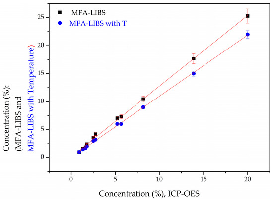Comparison of MFA-LIBS and MFA-LIBS combined with target-temperature results versus ICP-OES analysis for the representative sample S7.