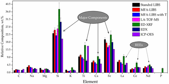 In Figure 12, we compare the qualitative and quantitative results for sample S7 obtained using LIBS, TOF, EDX, and XRF with ICP-OES as the reference. Qualitatively, all techniques successfully detect REEs; however, XRF shows differences in the quantitative detection of Ce, where its results are less consistent. All methods identify nearly the same elements, except XRF, which fails to detect carbon, due to its detection limitations. Interestingly, XRF detects phosphorus (P), which is missed by the other techniques.