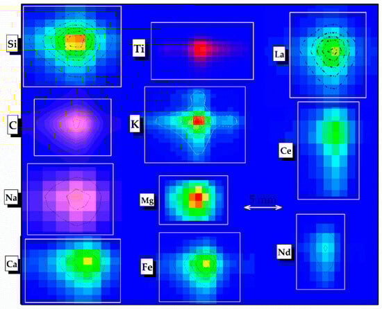 In this study, elemental mapping of each sample surface was performed using spectral data collected across a 15 × 15 array, with individual laser shots spaced 25 µm apart. Each spectrum was acquired from a single shot, and the scanning was automated using a displacement program that controlled both the shot frequency and stage movement. This process generated two-dimensional maps at a fine spatial scale, illustrating the relative emission intensities of various elements and revealing their geochemical behaviors. Separate panels of different sizes were created, to display the spatial distributions of elements such as Si, C, Na, Ca, Ti, K, Mg, Fe, and REEs including La, Ce, and Nd. The maps cover an area of 5 × 5 mm2, with features labeled to indicate the distribution of these elements, as shown in Figure 13. Scanning was performed at 10 different locations using an automated revolving stage operating at 50 rpm, and the data obtained from these scans were averaged to produce the final results. The spectral lines used for microscale elemental mapping were Ca (I) = 616.2 nm, C (I) = 247.8 nm, Ce (II) = 446.0 nm, Fe (I) = 373.5 nm, K (I) = 766.5 nm, La (II) = 492.1 nm, Mg (II) = 279.6 nm, Na (I) = 588.9 nm, Nd (II) = 388.8 nm, Si (I) = 288.2 nm, and Ti (I) = 334.9 nm.