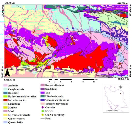 One of the most important steps in MPM is the definition of an appropriate conceptual and descriptive model for the mineralization being sought [19]. A conceptual model includes the key characteristics and criteria of the mineralization being sought and is defined based on the characteristics of similar known mineral occurrences (KMOs). This model helps exploration geologists to select relevant criteria and identify new exploration targets in the region. In other words, important evidence layers for MPM are selected according to this descriptive model, which emphasizes the importance of defining an accurate conceptual model. Based on the studies on hydrothermal copper deposits and previous MPM research in this region, the following key features can be used to build a prospectivity model for hydrothermal copper: