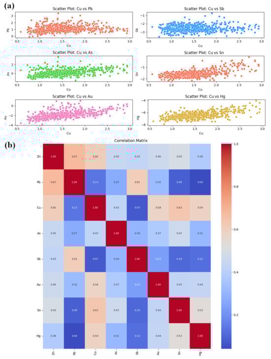 (a) The relationship between Cu and the key elements. (b) A correlation matrix heatmap for the key elements related to the hydrothermal copper mineralization.