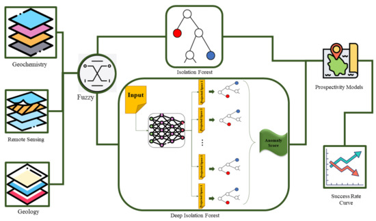 Figure 5 illustrates the methodological flowchart used in this study to analyze the geospatial data and generate a mineral potential model for the hydrothermal copper deposits in the Feizabad district. As a first step, geochemical, geological, and remote sensing layers were created using appropriate analytical techniques. To reduce the uncertainty and improve the accuracy of the results, we used logistic functions to convert the values into fuzzy space [6,51]. In the next step, we used intelligent algorithms, namely the IForest and DIF algorithms, to combine the geospatial data and detect anomalies. Finally, a data-driven success rate curve was used to evaluate the prospectivity models.